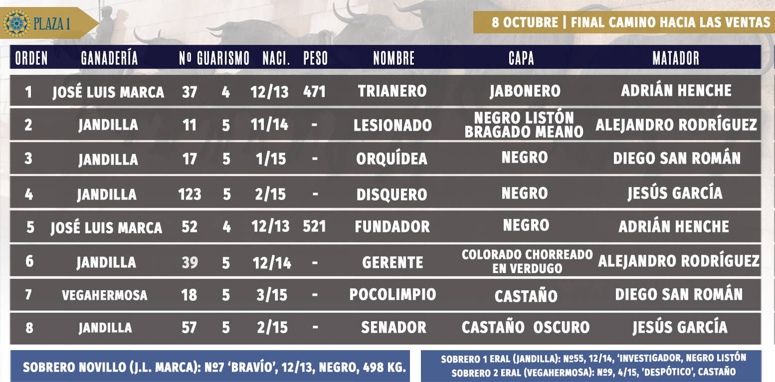 El novillero con picadores Adrián Henche sufrió una voltereta en el primero de la tarde, un novillo de José Luis Marca al que le correspondió dar muerte al sobresaliente Víctor Manuel Rodado, quien escuchó los tres avisos y tuvo que ser atendido en la enfermería. No pudo continuar la lidia, por lo que el segundo novillo reseñado no fue lidiado.